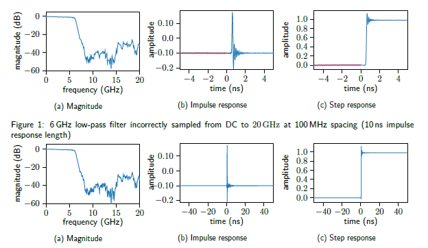 An example of incorrect and correct frequency resolution, and therefore impulse response length, is shown in figure 1 and figure 2, respectively. The frequency resolution difference between the incorrectly and correctly sampled magnitude responses in figure 1a and 2a are barely discernible, and looking in the frequency domain only does not reveal any problems. However, when viewed in the time domain [2], the impulse and step response plots in figure 1b and figure 1c reveal causality violations (shown in red). It is clear that this is due to the end of the time-domain responses wrapping into the negative time locations due to insufficient length. These violations are not actually too bad, but there are many worse scenarios. The impulse and step response plots in figure 2b and figure 2c are shown to be well settled due to the finer frequency resolution (longer impulse response length).