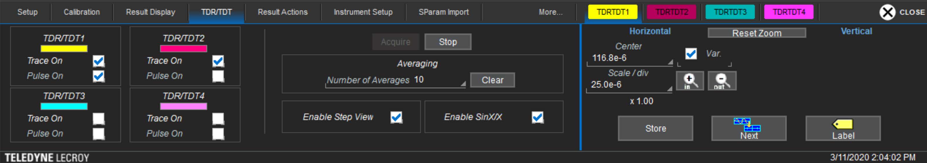 That being said, it is very easy with a TDR instrument to inspect things and ascertain the proper settings by simply looking at the raw TDR traces. This is done by accessing the TDR/TDT tab on the WavePulser menu, as shown in figure 4. Here, the four instrument ports and their setup information are shown on the left with the color of the waveform, whether the trace is being displayed, and whether the pulser is on. This example is is set up for a two-port measurement with TDR port 1 sending pulses. In the middle of the menu are the acquisition controls, which are set to ten averages, in step display mode, and with SinX/X enabled. Finally, the right side of the menu controls the zooming.