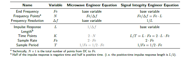 The last column contains what are referred to as the signal integrity equations. In these equations, there are two base variables assumed to affect all the others. These are the end frequency, the highest frequency of interest, and the impulse response length. If you are unfamiliar with the concept of impulse response length, simply consider it as twice the amount of time it takes for the response to an applied ideal impulse to completely die out1. Later, this paper discusses how to estimate that amount and how to measure it.