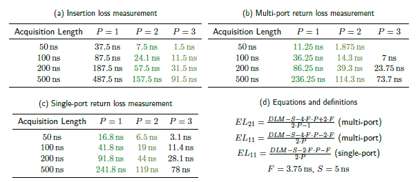 Using the fact that the time from the internal pulser/sampler to the end of the cable for a port is 3.75 ns and that 5 ns is trimmed from each acquisition to account for the time just before the pulse, equations are developed and maximum electrical lengths tabulated for each of the acquisition length modes in the WavePulser, and for each of the path assumptions for the impulse response. These are shown in table 2. The equations are provided in table 2d. Multi-port (more than one) values for insertion loss measurements are provided in table 2a, where the P = 2 (highlighted in green) values are adequate, with P = 3 (highlighted in light green) providing maximum performance. Similarly, multi-port values for return loss measurements are provided in table 2b, where the P = 1 values are adequate, with P = 2 providing maximum performance. When only a single-port return loss measurement is made, one need only account for the fixture and cabling of a single port and the DUT, so electrically longer devices can be measured, as shown in table 2c.