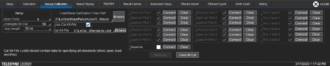 The user connects the standards to the instrument ports, presses the Connect button next to the particular standard/port combination, then presses the Measure button. After the required acquisitions are complete, a check mark is placed in the box for that standard/port combination, and the user continues making measurements until all of the boxes are filled in, after which the combination of the measurements taken and the calibration standard definitions are converted into the error terms for the manual calibration. After a manual calibration, the calibration type shown in figure 2 is left as Manual, and none of the Auto calibration discussed previously is applied. The error terms are applied to raw measurements of the DUT and none of the internal calibration standards are used, nor any of the internal path de-embedding operations. VNA users would be familiar with this process as this is the only way to calibrate it.