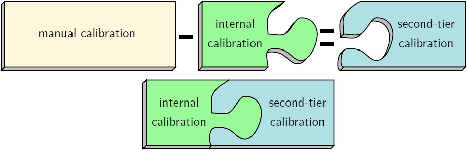 Once the internal calibration has been performed, ideally very close in time to the completion of the manual calibration, a button to create the second-tier calibration file is activated, as shown at the right of menu in figure 4. The calculation of the second-tier calibration is quite complicated, but is shown stylistically in figure 5. The basic idea of the calculation is to constrain the second-tier calibration error terms such that the internal calibration combined with the second-tier calibration produces the same error terms as the manual calibration.