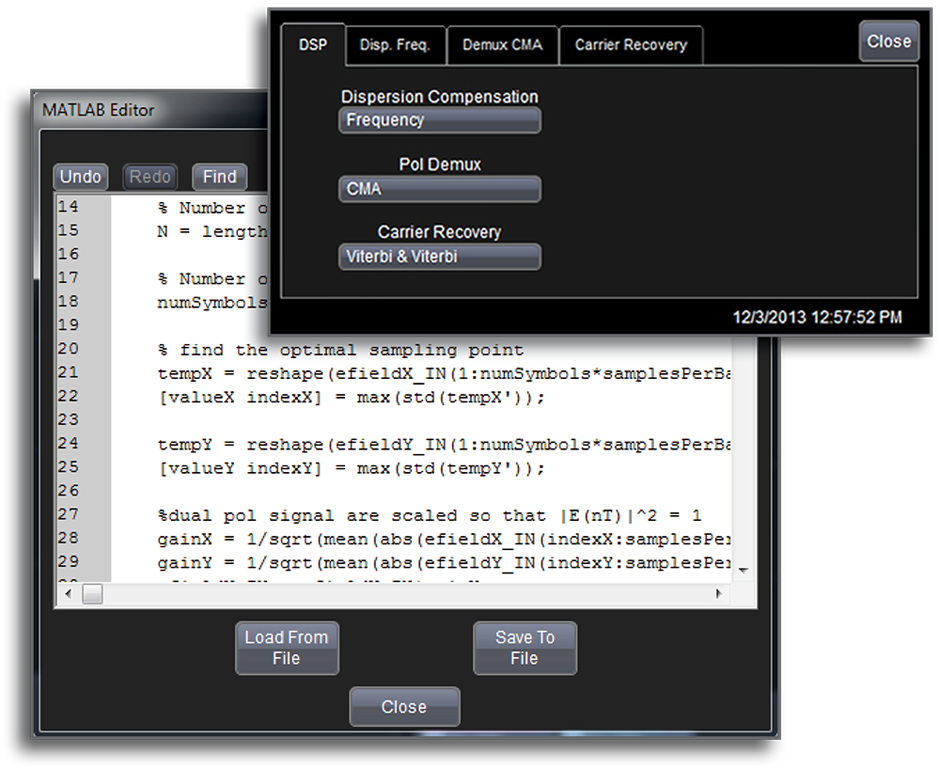 数字信号处理 (DSP) 算法的测试和验证是收发器开发的重要组成部分。 OpticalLinQ 配备内置 DSP 算法,例如 CMA、MMA、Viterbi 和 Viterbi,供您用作经过测试的参考算法。 自定义代码集成功能允许您以 MATLAB 格式使用和验证您自己的算法。
