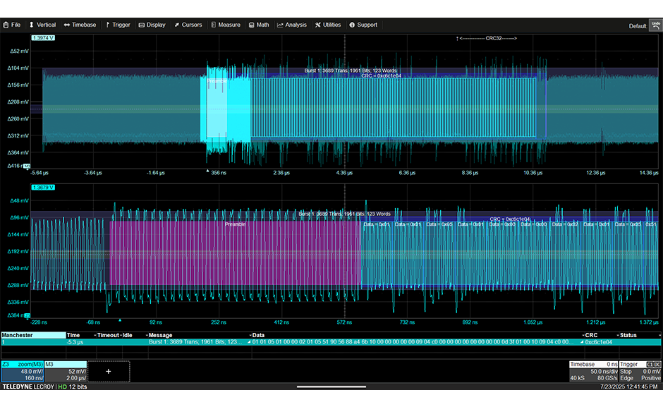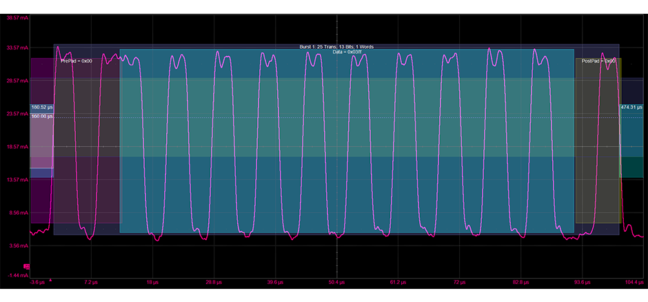 颜色编码的叠加层直接在物理层波形的顶部显示协议解码,以实现易于理解的视觉显示。 解码信息根据时基或缩放设置压缩或扩展,从而简化常规验证和复杂的故障排除。
