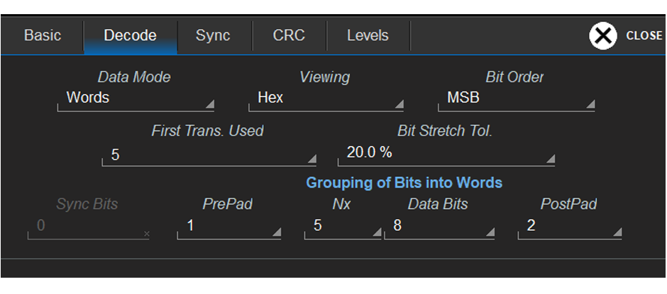 定义同步位、报头或前导码位、数据位和页脚或 CRC 位的数量,为专有总线构建自定义协议解码器,或解码基于 Manchester 或 NRZ 的行业标准总线,如 PSI5、DALI 和专有 NRZ 协议。
