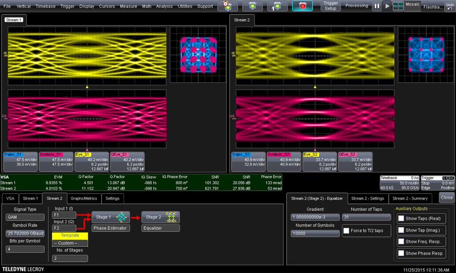 VectorLinQ 将您的 Teledyne LeCroy 示波器转变为最灵活的可用矢量信号分析平台。 通过示波器通道采集多达八个输入——PSK、QAM、Circular QAM 和 ASK 信号类型均受支持,以及用户定义的符号配置和 OFDM 格式。 VectorLinQ 通过独特、直观的模型运行,通过用户定义的处理块链传递信号,使最复杂的分析变得简单。 标准处理块包括混频器、滤波器、相位估计器和均衡器——以及在处理链中的任何点插入自定义 MATLAB 处理块的能力。
