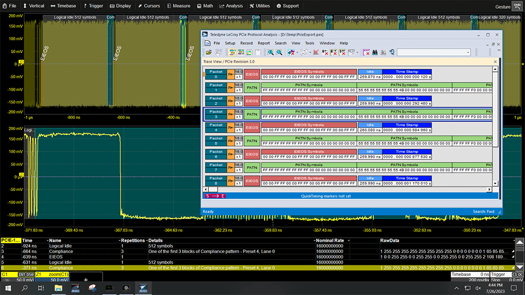 在发射器链路均衡期间,发射器的重点不仅需要响应正确的均衡请求,还需要在指定的时间内发生变化。电压波形包含有关物理层何时发生变化的信息,但不包含协议中何时发出更改请求的信息。ProtoSync 利用 Teledyne LeCroy 的行业标准协议分析软件将获取的波形解码至事务层。这使 QualiPHY 2 能够确定均衡更改请求的精确时间,从而全面了解链路训练行为。