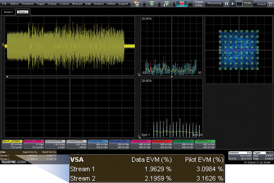 VectorLinQ VSA 提供了多种分析和查看解调波形的方法。 IQ 星座图有助于识别信号质量问题,例如幅度不平衡、正交误差和相位噪声。 I 和 Q 分量、幅度、功率、相位和 EVM 可被视为时域中的“迹线”,与示波器中的其他波形完全相关。 任何迹线也可以视为眼图,从而更深入地了解解调波形的信号质量。 总信号的频谱视图,以及单独的 I 和 Q 分量,也作为标准提供。 对于 OFDM 信号,EVM 可以按子载波和符号显示。