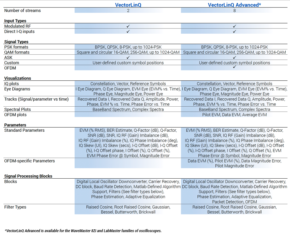 VectorLinQ 将您的 Teledyne LeCroy 示波器转变为最灵活的可用矢量信号分析平台。 通过示波器通道采集多达八个输入——PSK、QAM、Circular QAM 和 ASK 信号类型均受支持,以及用户定义的符号配置和 OFDM 格式。 VectorLinQ 通过独特、直观的模型运行,通过用户定义的处理块链传递信号,使最复杂的分析变得简单。 标准处理块包括混频器、滤波器、相位估计器和均衡器——以及在处理链中的任何点插入自定义 MATLAB 处理块的能力。