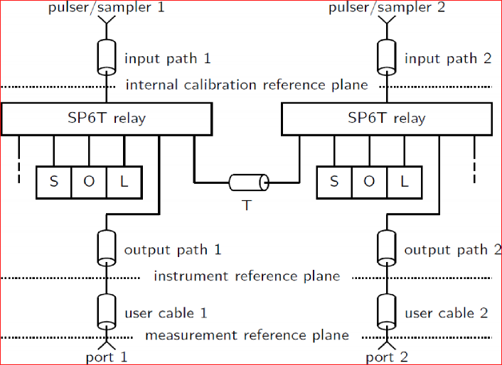 In figure 1, there are two pulser/sampler modules connected through input paths, which are semi-rigid coaxial cables, to the common inputs of the single-pole-six-throw (SP6T) relays. The outputs of the relays have connections to various standards, including short, open, and load standards, as well as a thru standard connection between the ports. The outputs shown unconnected are for other thru standard connections between the other ports of the instrument that are not shown. For each port, one relay output connects to the output path, which is also a semi-rigid cable, leading to the bulkhead connector of the instrument. Finally, user cables connect from the bulkhead connector the DUT.