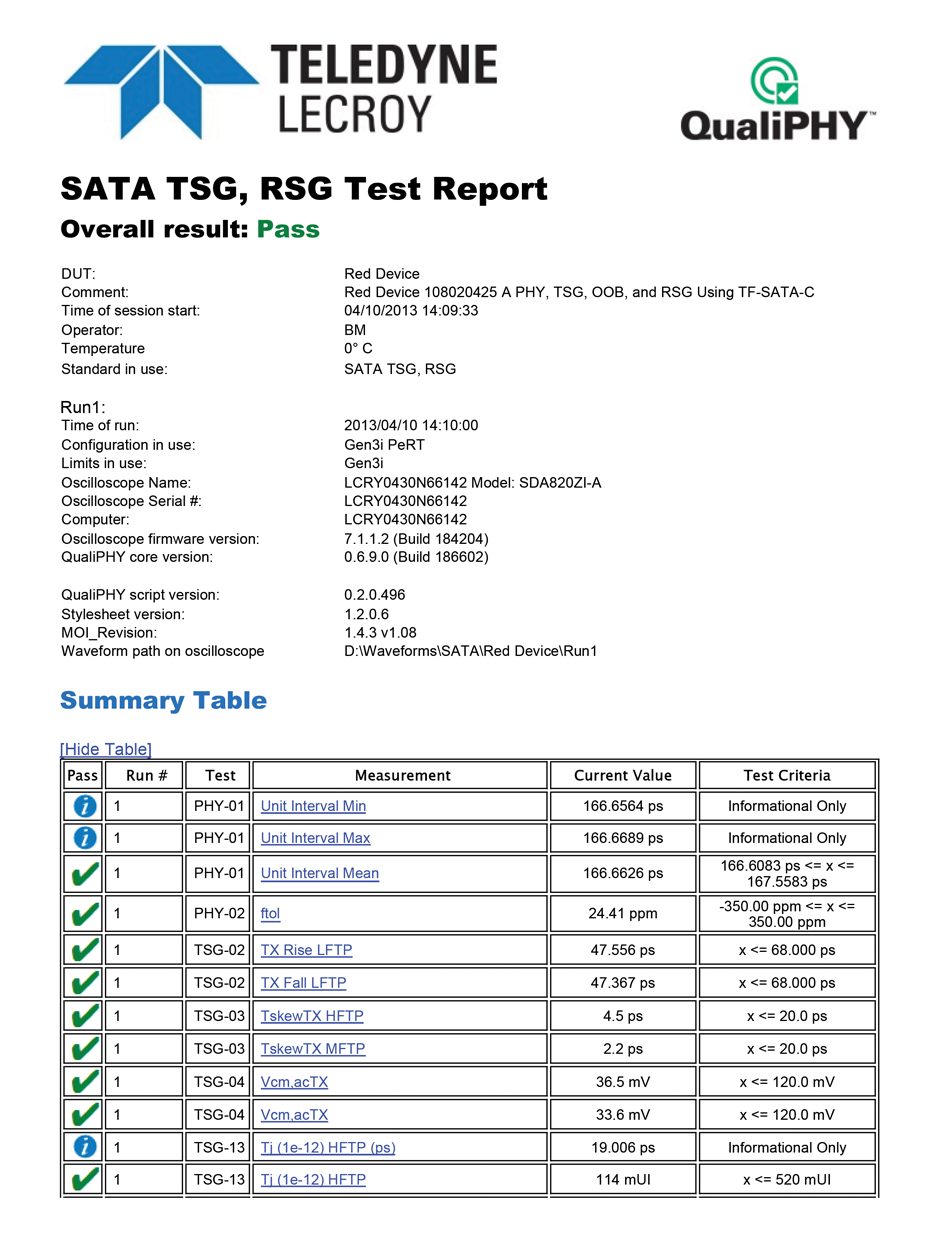 - 支持 SATA UTD 1.5 描述的所有 PHY、TSG、OOB 和 RSG 一致性测试