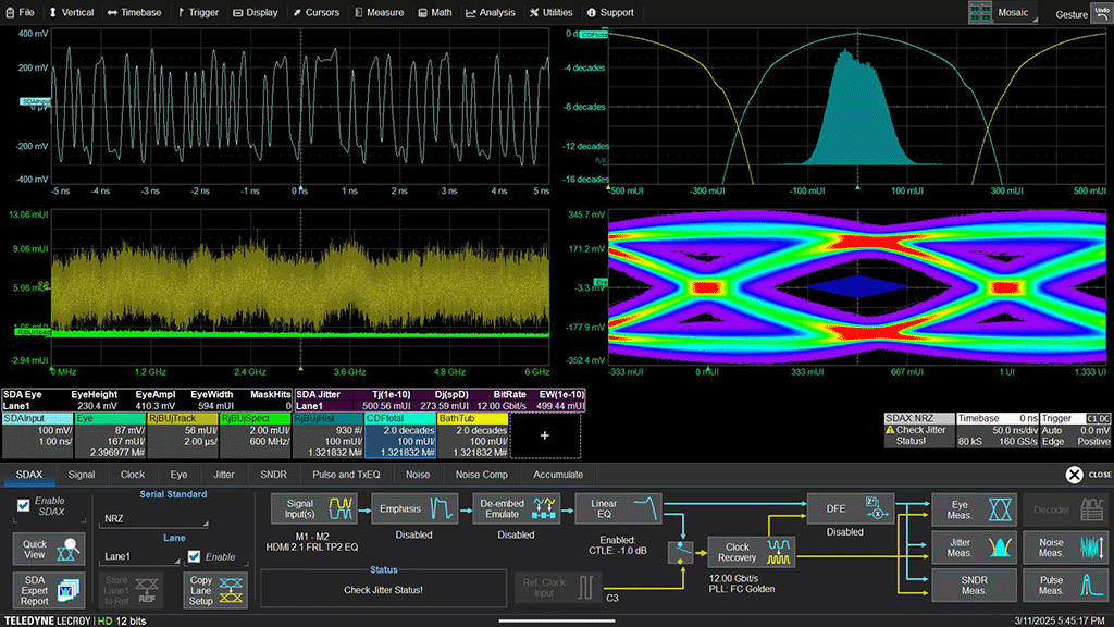 使用 QPHY-HDMI21 时,用户可以在测试过程中选择“出现故障时暂停”;这样用户就可以使用示波器的任何工具进一步调试,并在完成后单击按钮恢复测试。SDAX Expert 分析软件 (SDAX-Complete) 提供从 TP1 到 TP2 的完整分析,以快速识别发射机信号完整性故障的根本原因。
