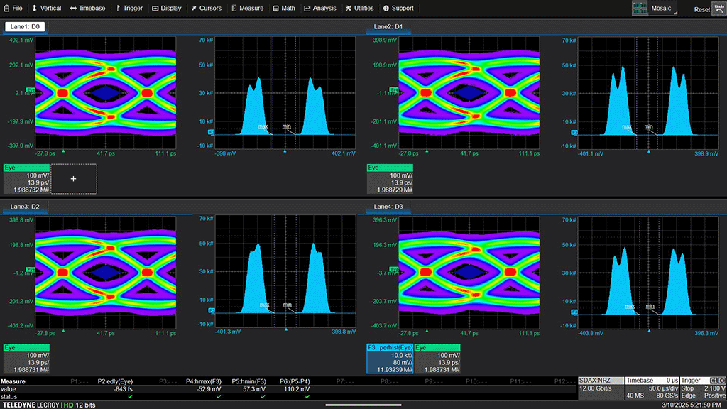 HDMI 2.1 规范要求以 80 GS/s 的速度测试多达四个差分通道。用户必须在示波器和被测设备之间建立必要的连接,配置示波器,执行测试,并将结果与合规性规范中的通过/失败限制进行比较。QPHY‑HDMI21 为您完成所有这些步骤,并采用经过优化的分步程序,以实现更快的测试时间。