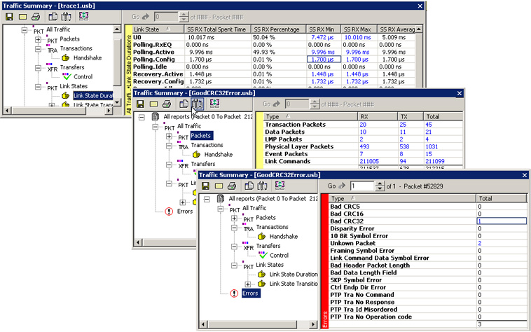 这个 Voyager 软件提供了许多机制来测量和报告 USB 2.0 和 3.0 协议。 通过流量摘要显示,用户可以一目了然地评估统计报告或导航到单个事件。 用户可以选择事务数据包来查看 ACK/NAK 或设备通知事件,然后通过一次按键跳转到每个事件。 可提供显示链路吞吐量和流量控制指标的报告。 更高级别的事件也会在逻辑 USB 传输级别进行跟踪和报告。 错误报告显示了一系列协议违规 - 从无效的 CRC 到帧错误。
