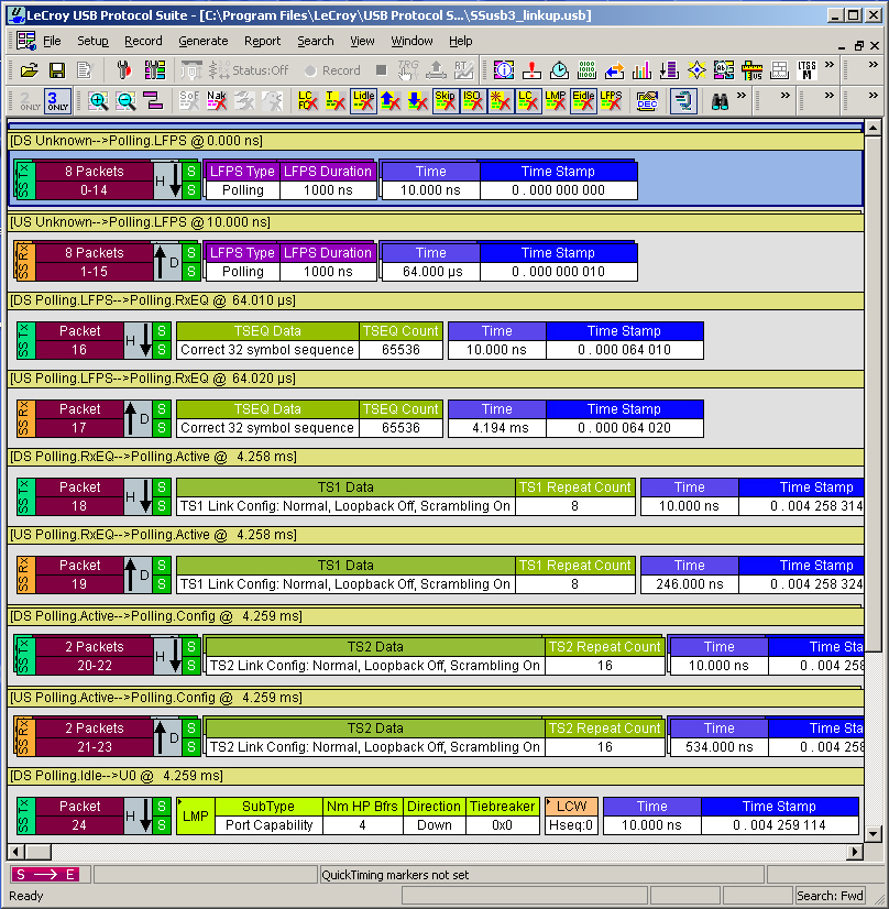 这个 Voyager 是市场上唯一一款能够捕获 5Gbps USB 链路上的每个转换的分析仪,包括空闲、数据包间符号和损坏的 10 位符号。 Link Tracker 提供所有有序集的时间顺序上游/下游显示,时间分辨率为 2ns。 旨在协助低级调试,包括训练序列在内的所有符号都可以原始 10 位、8 位、加扰和未加扰的十六进制格式显示。 只需单击一下即可进行符号到符号的时序测量。